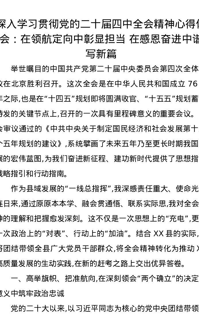 深入学习贯彻党的二十届四中全会精神心得体会:在领航定向中彰显担当 在感恩奋进中谱写新篇