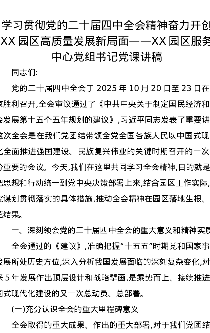 学习贯彻党的二十届四中全会精神奋力开创XX园区高质量发展新局面——XX园区服务中心党组书记党课讲稿