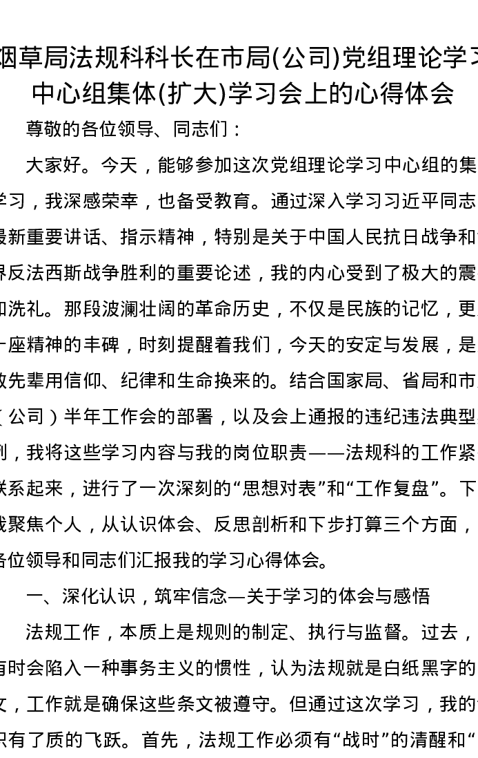 烟草局法规科科长在市局(公司)党组理论学习中心组集体(扩大)学习会上的心得体会