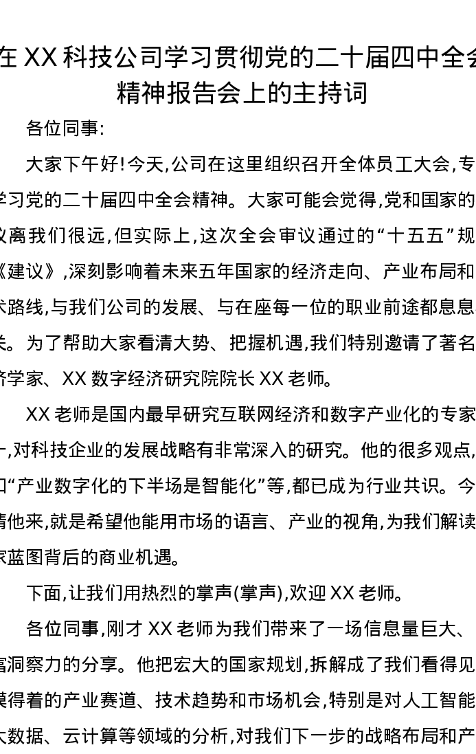 在XX科技公司学习贯彻党的二十届四中全会精神报告会上的主持词