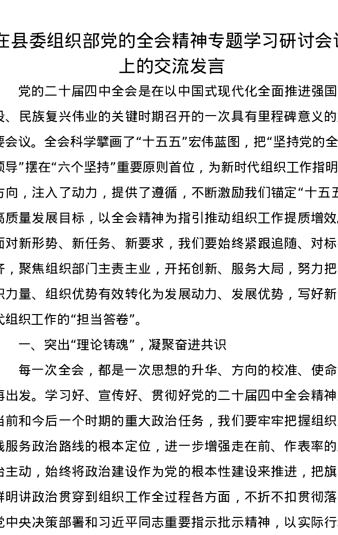 在县委组织部党的二十届四中全会精神专题学习研讨会议上的交流发言