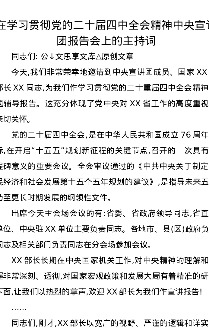 在学习贯彻党的二十届四中全会精神中央宣讲团报告会上的主持词