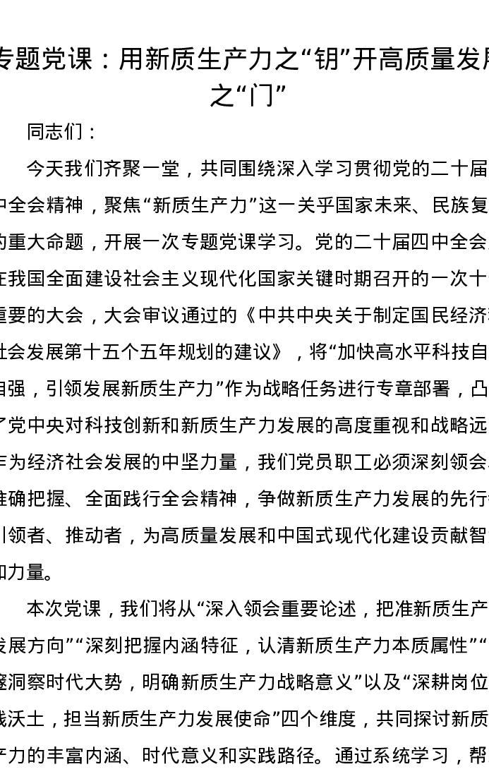 党课讲稿:用新质生产力之“钥” 开高质量发展之“门”