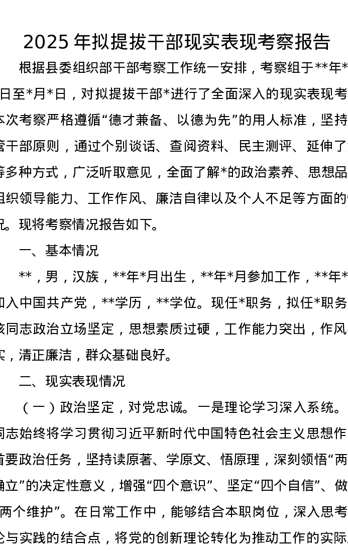 2025年拟提拔干部现实表现考察报告