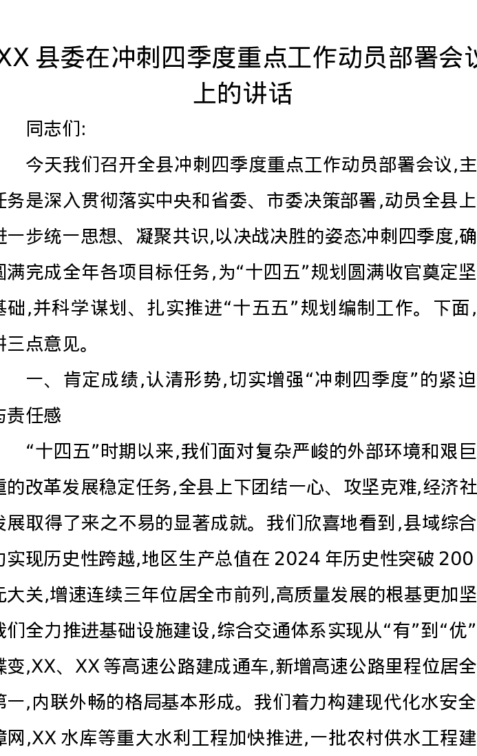 XX县委在冲刺四季度重点工作动员部署会议上的讲话