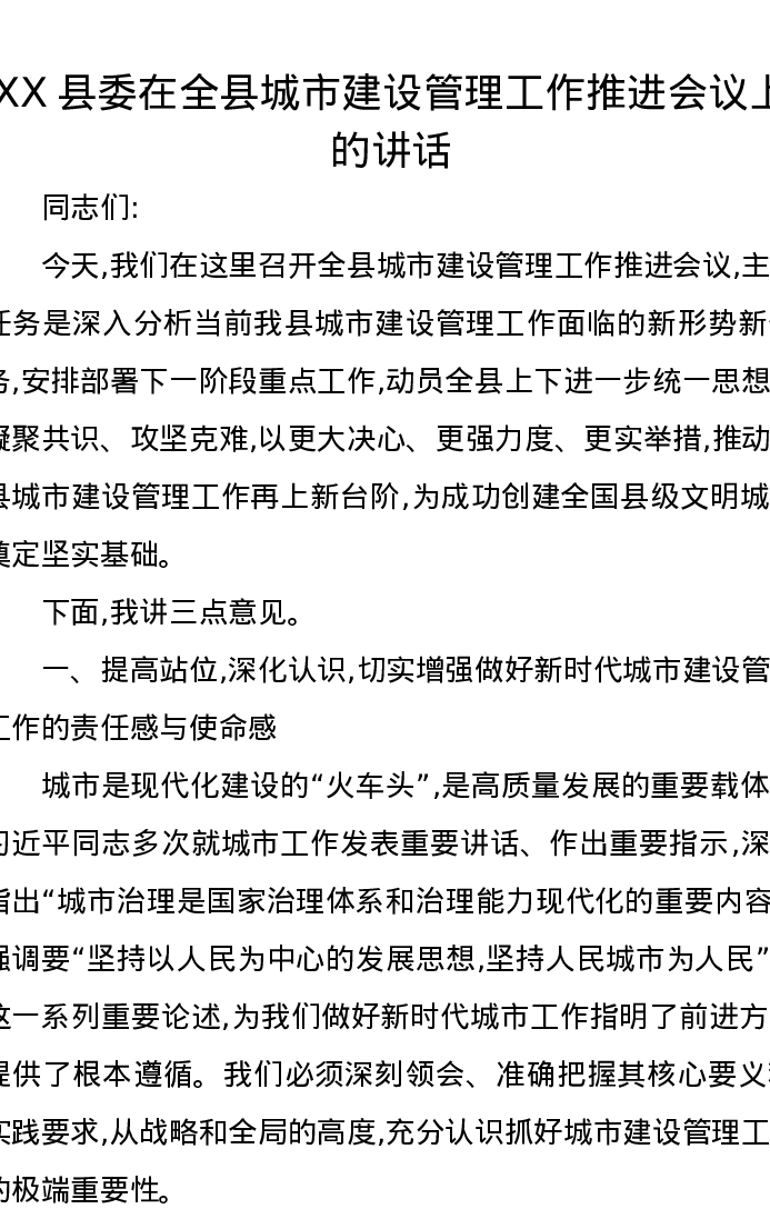 XX县委在全县城市建设管理工作推进会议上的讲话