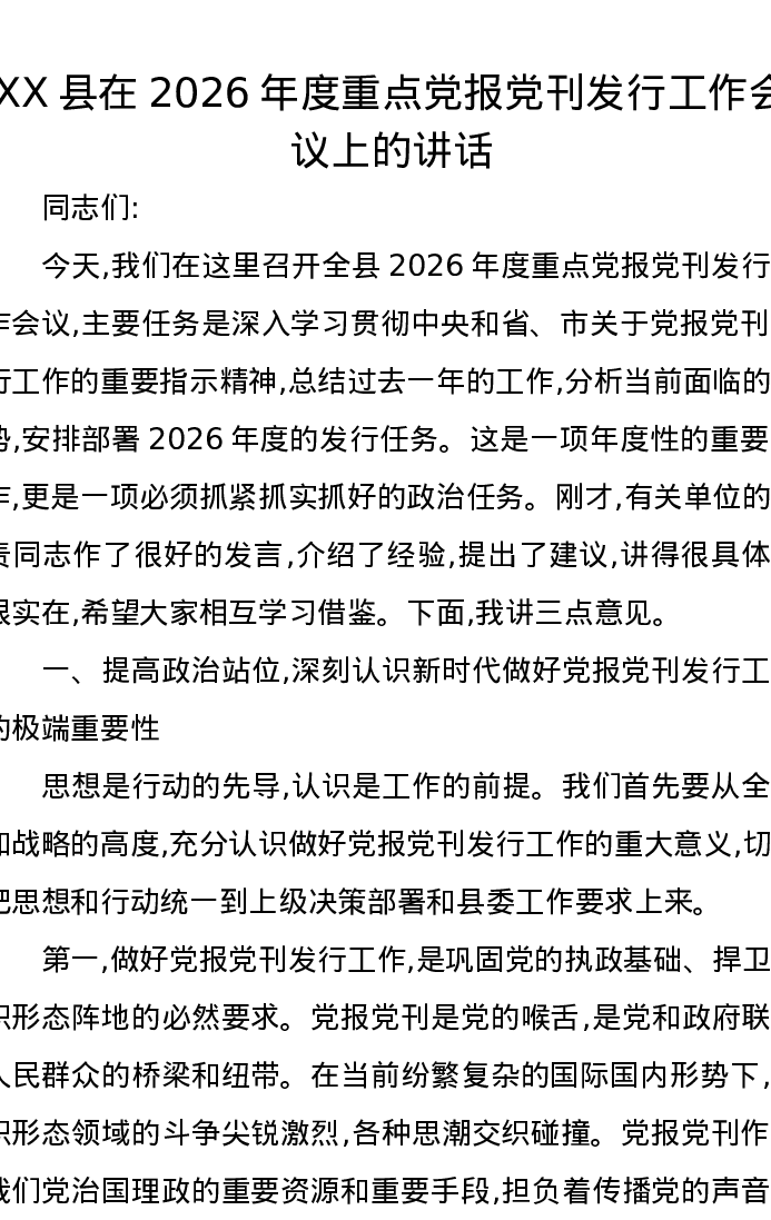 XX县在2026年度重点党报党刊发行工作会议上的讲话