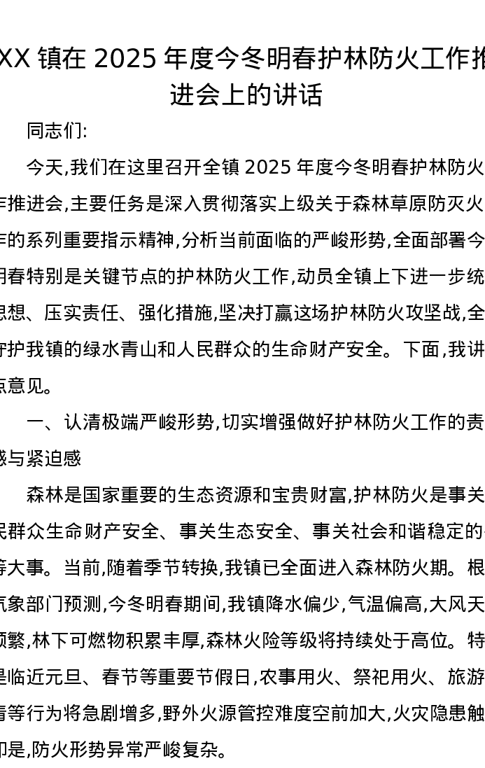 XX镇在2025年度今冬明春护林防火工作推进会上的讲话