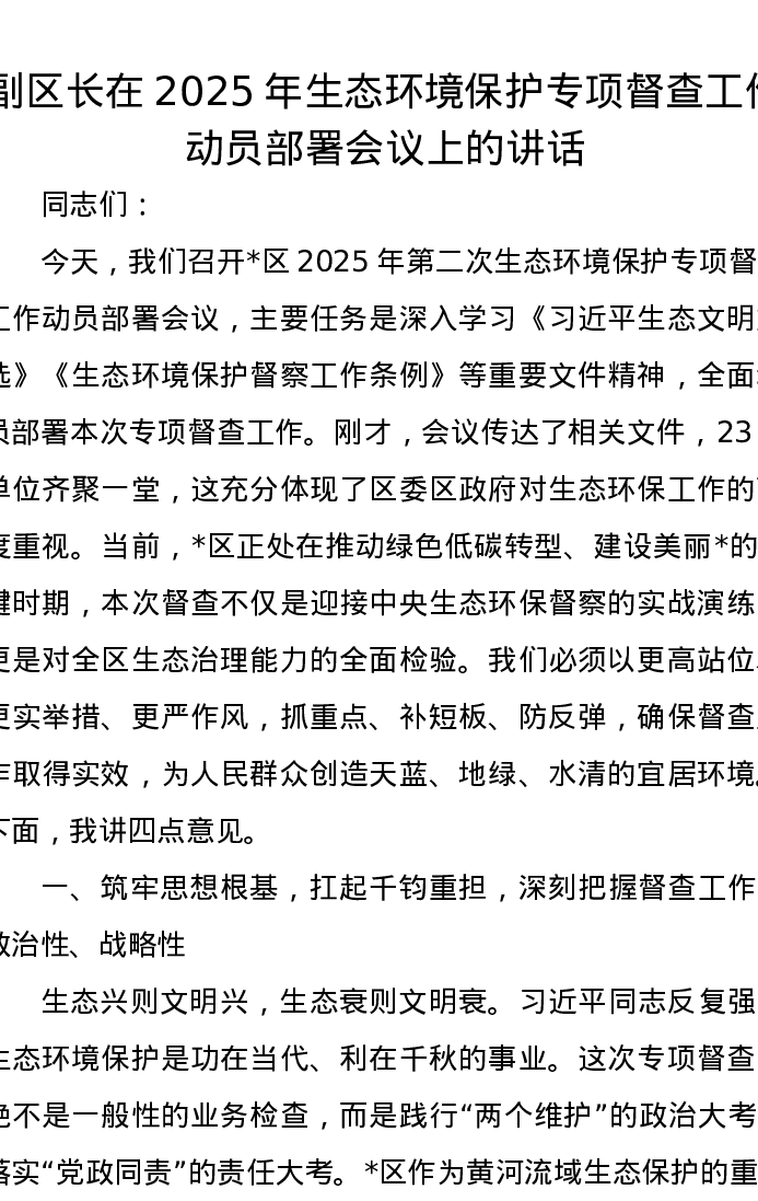 副区长在2025年生态环境保护专项督查工作动员部署会议上的讲话