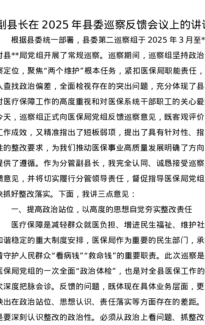 副县长在2025年县委巡察反馈会议上的讲话