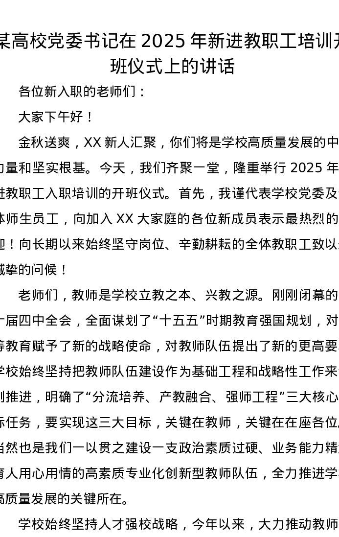 某高校党委书记在2025年新进教职工培训开班仪式上的讲话