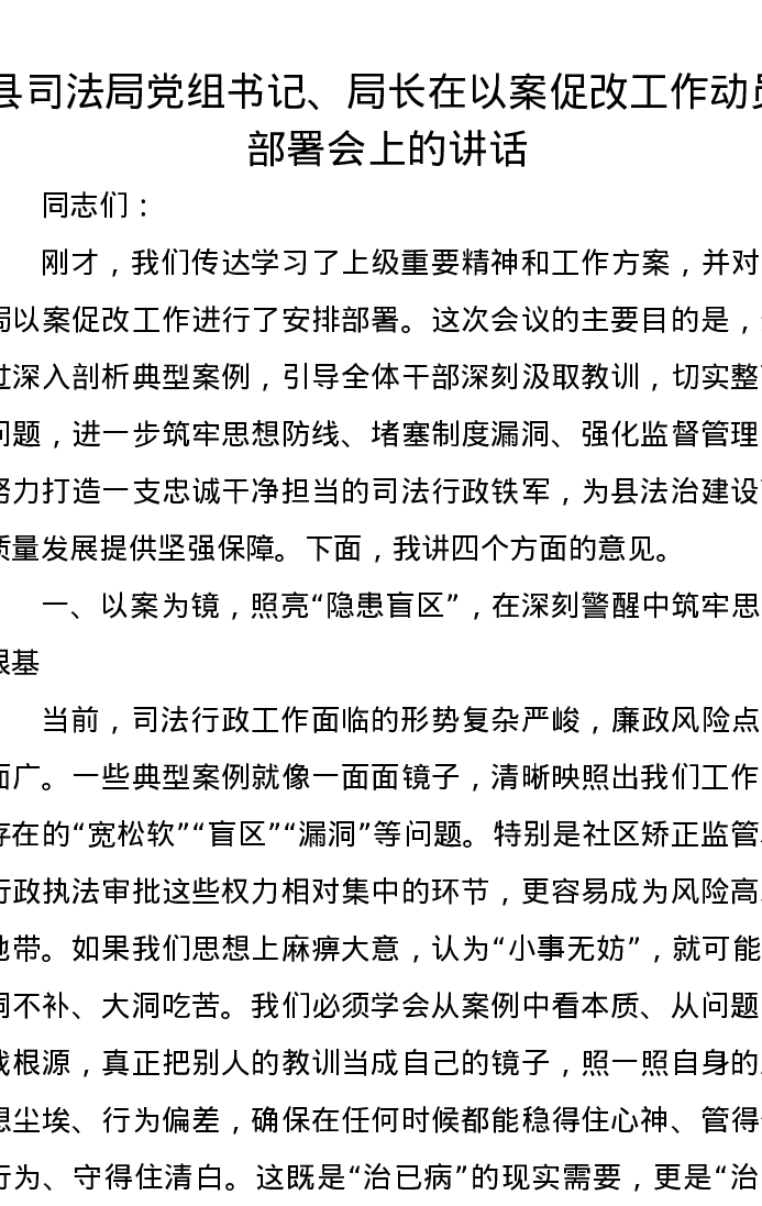 县司法局党组书记、局长在以案促改工作动员部署会上的讲话