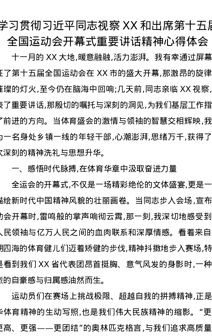 学习贯彻习近平总书记视察XX和出席第十五届全国运动会开幕式重要讲话精神心得体会