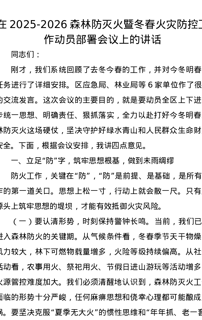 在2025-2026森林防灭火暨冬春火灾防控工作动员部署会议上的讲话