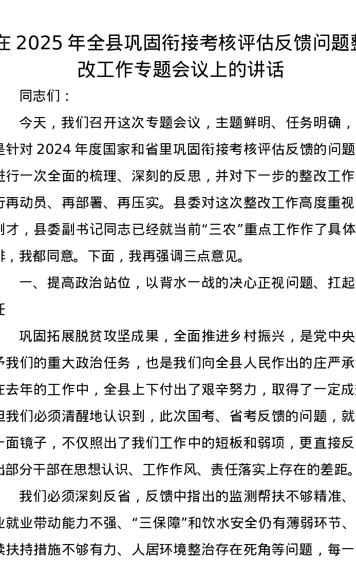 在2025年全县巩固衔接考核评估反馈问题整改工作专题会议上的讲话