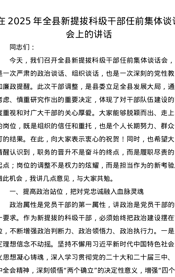 在2025年全县新提拔科级干部任前集体谈话会上的讲话