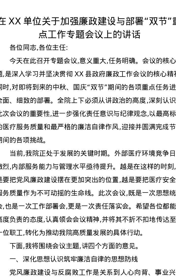 在XX单位关于加强廉政建设与部署“双节”重点工作专题会议上的讲话