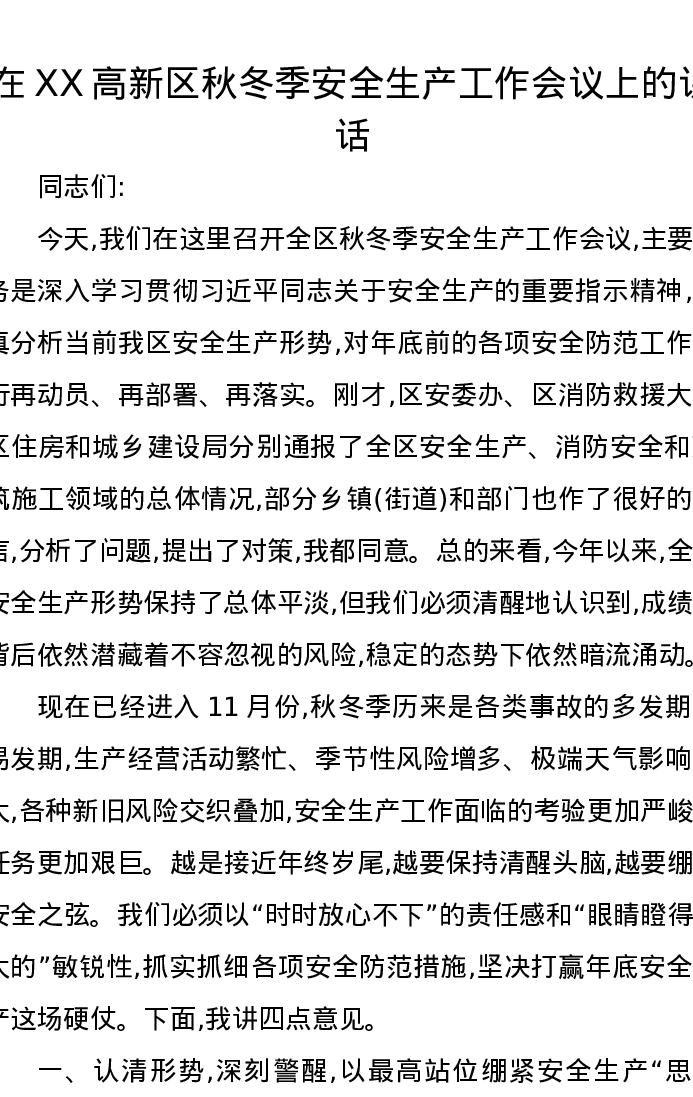 在XX高新区秋冬季安全生产工作会议上的讲话