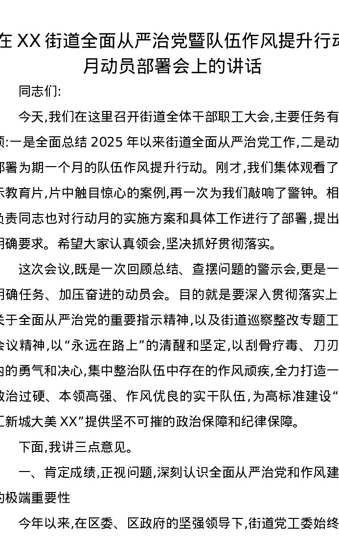 在XX街道全面从严治党暨队伍作风提升行动月动员部署会上的讲话