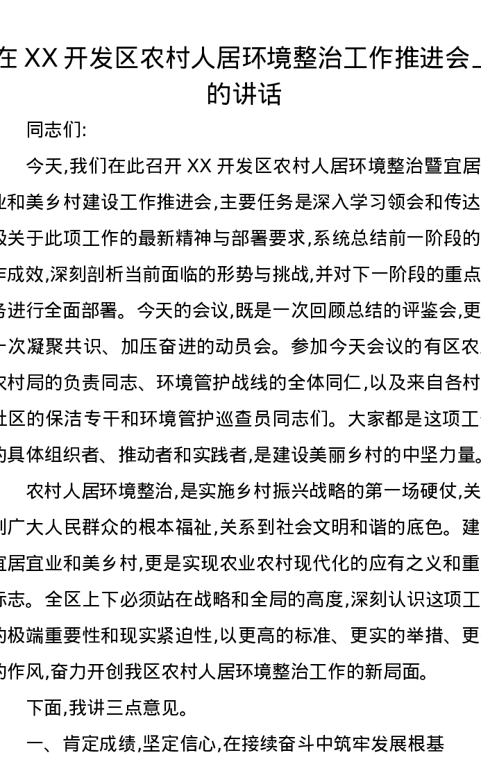在XX开发区农村人居环境整治工作推进会上的讲话