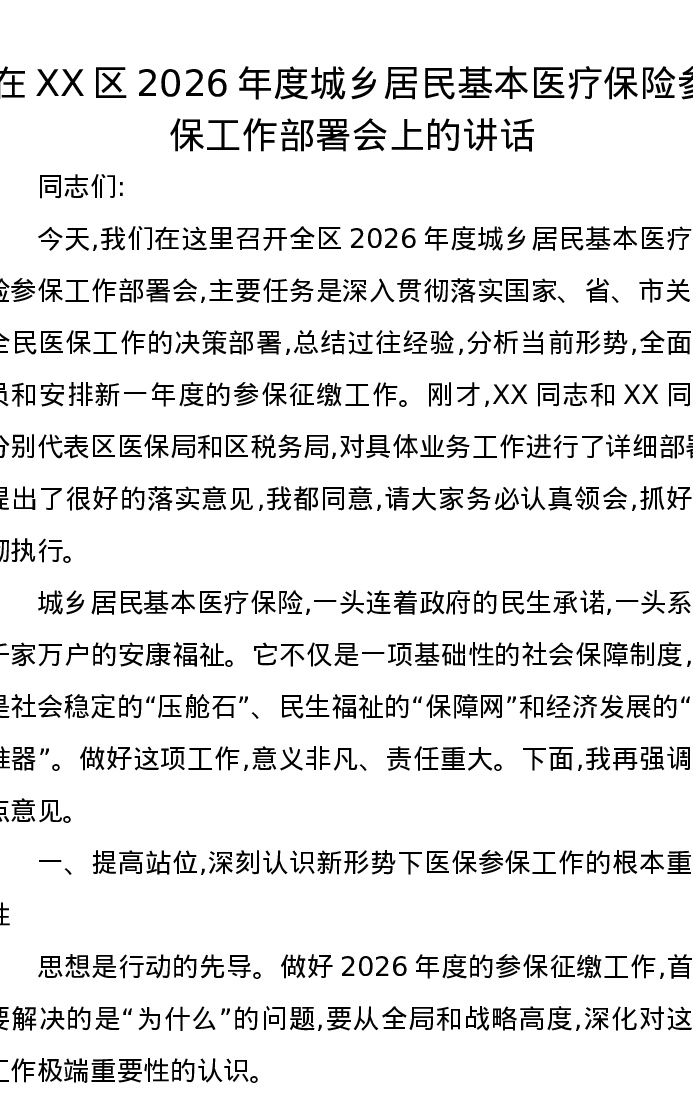 在XX区2026年度城乡居民基本医疗保险参保工作部署会上的讲话