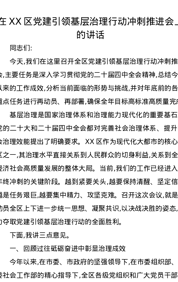 在XX区党建引领基层治理行动冲刺推进会上的讲话