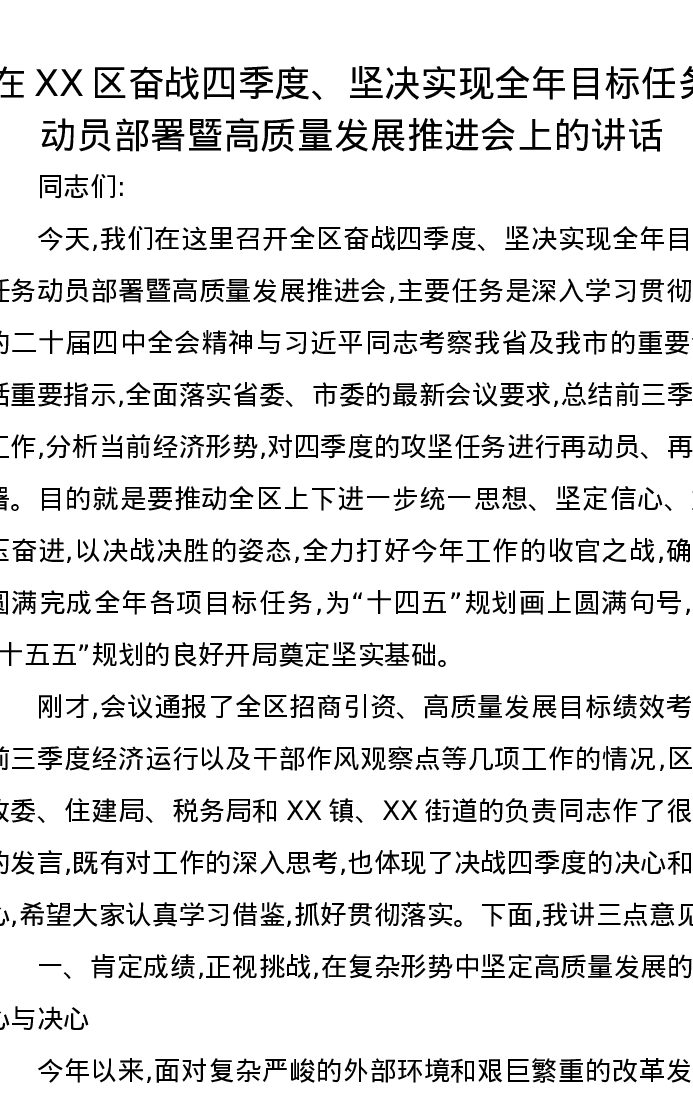 在XX区奋战四季度、坚决实现全年目标任务动员部署暨高质量发展推进会上的讲话