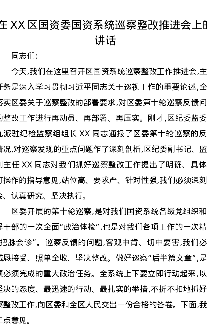 在XX区国资委国资系统巡察整改推进会上的讲话