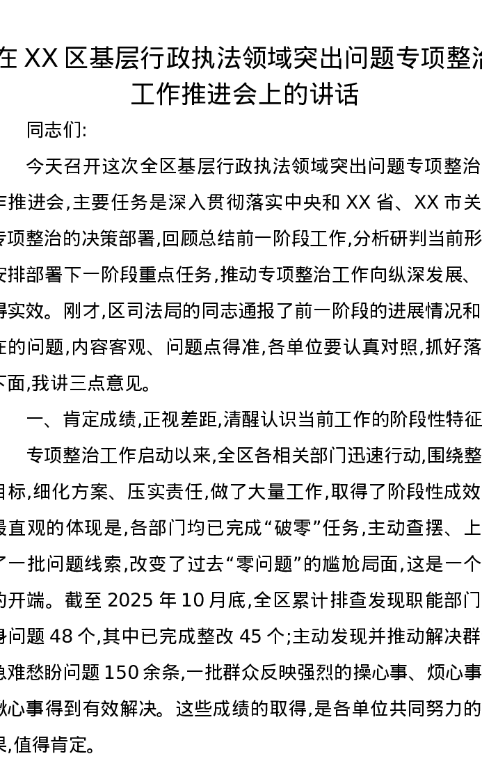 在XX区基层行政执法领域突出问题专项整治工作推进会上的讲话
