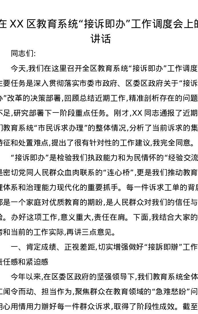 在XX区教育系统“接诉即办”工作调度会上的讲话
