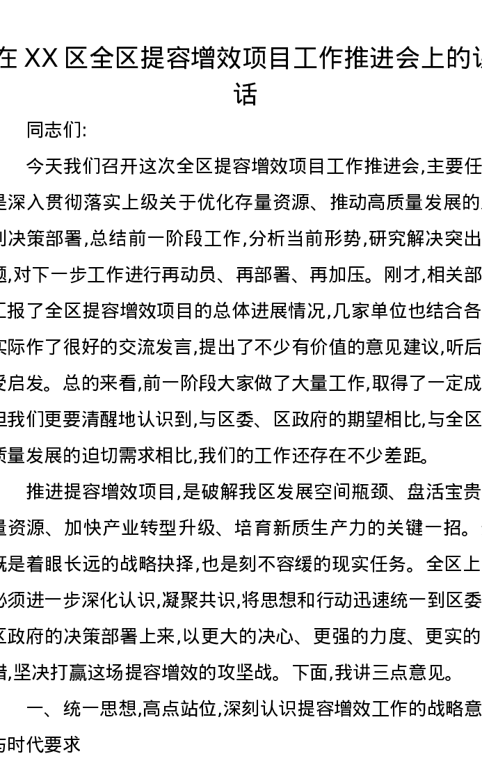 在XX区全区提容增效项目工作推进会上的讲话