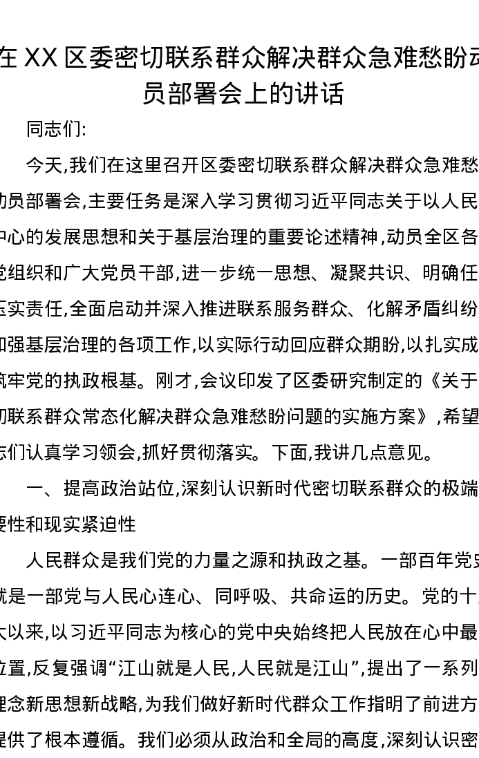 在XX区委密切联系群众解决群众急难愁盼动员部署会上的讲话
