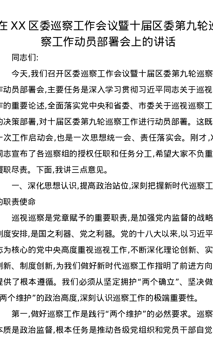 在XX区委巡察工作会议暨十届区委第九轮巡察工作动员部署会上的讲话