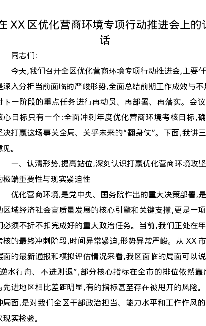 在XX区优化营商环境专项行动推进会上的讲话
