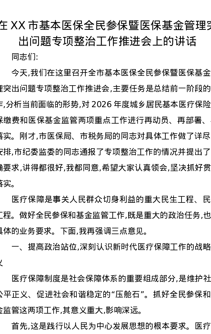 在XX市基本医保全民参保暨医保基金管理突出问题专项整治工作推进会上的讲话