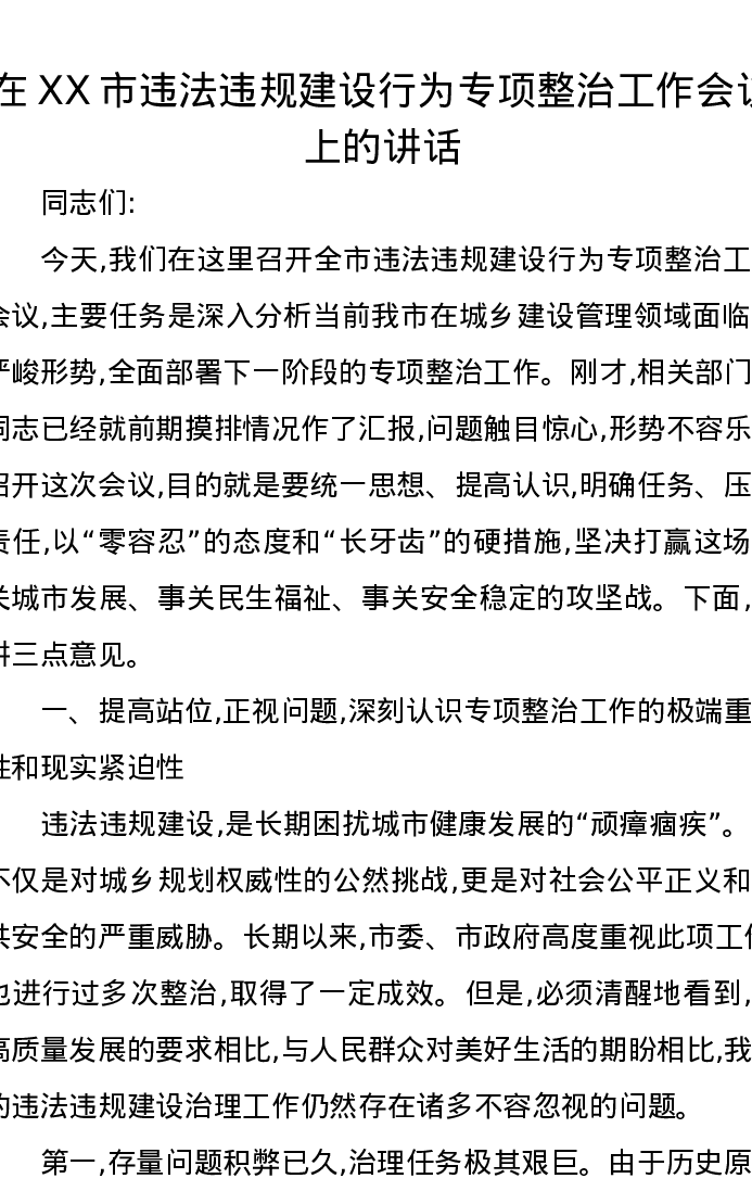 在XX市违法违规建设行为专项整治工作会议上的讲话