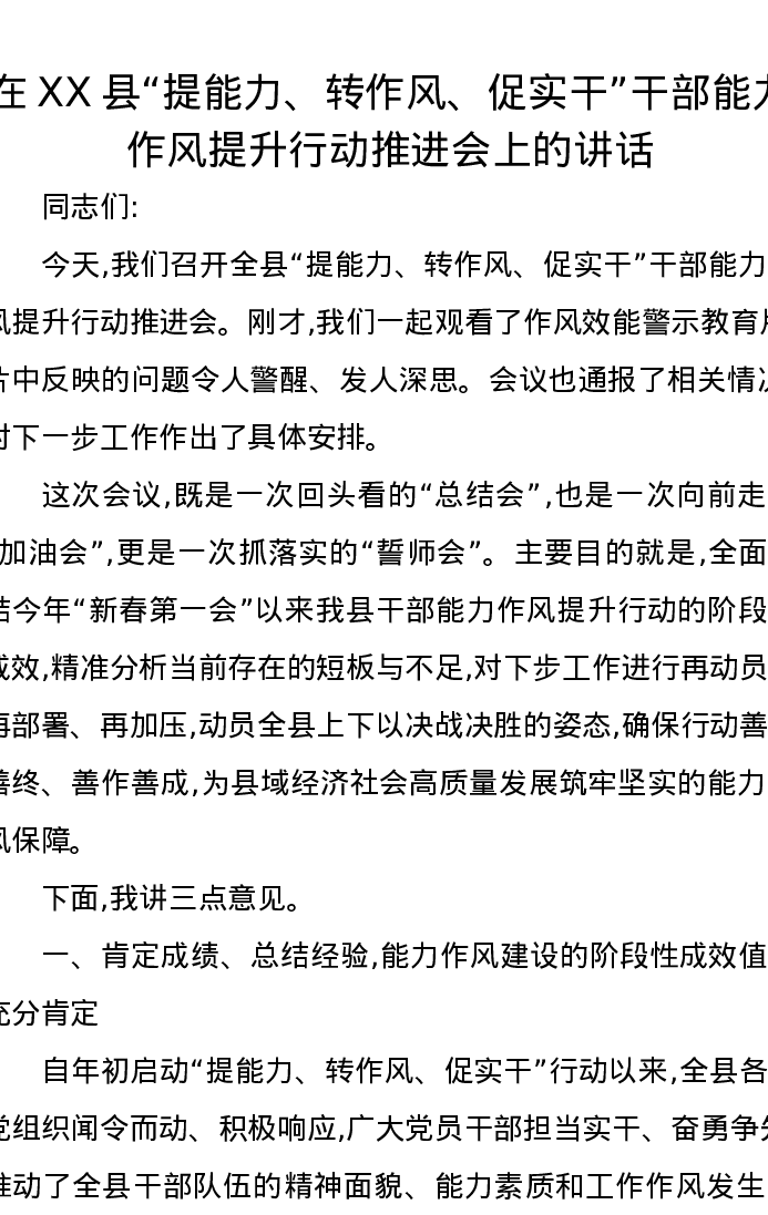在XX县“提能力、转作风、促实干”干部能力作风提升行动推进会上的讲话