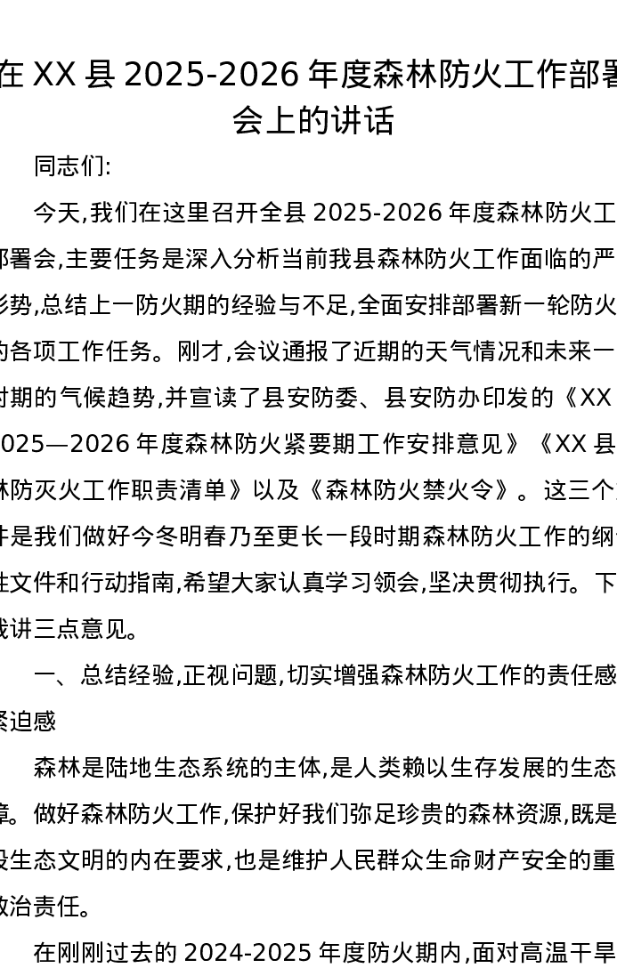 在XX县2025-2026年度森林防火工作部署会上的讲话