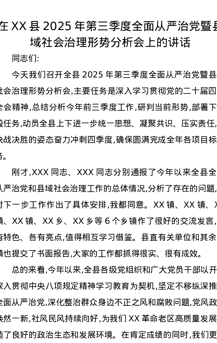 在XX县2025年第三季度全面从严治党暨县域社会治理形势分析会上的讲话