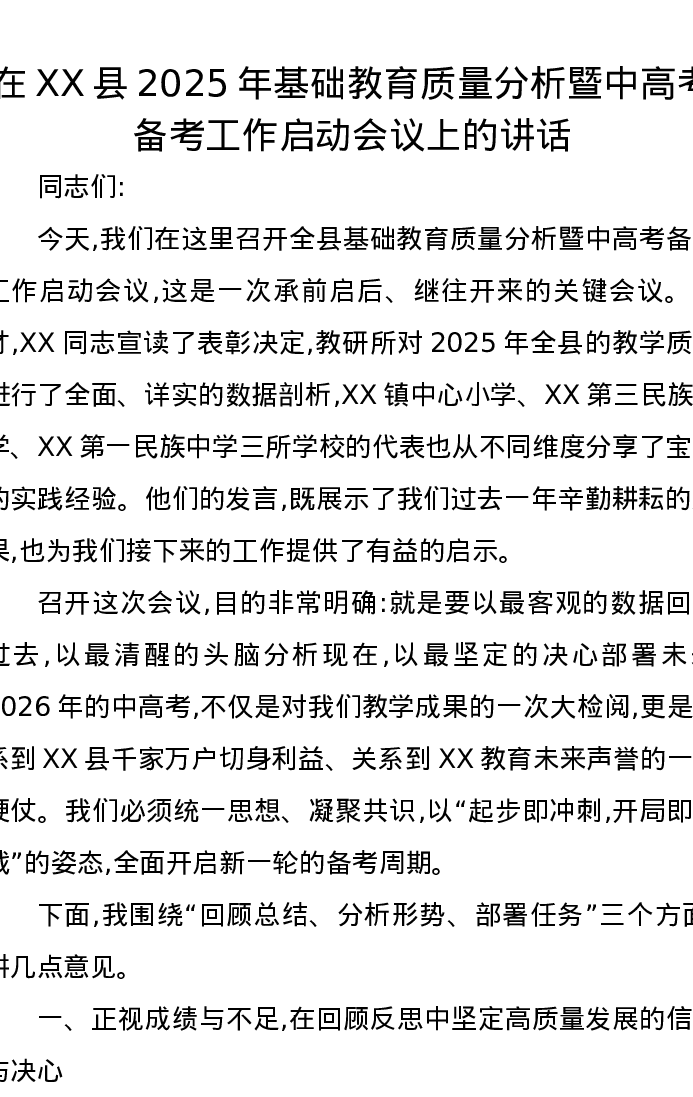 在XX县2025年基础教育质量分析暨中高考备考工作启动会议上的讲话