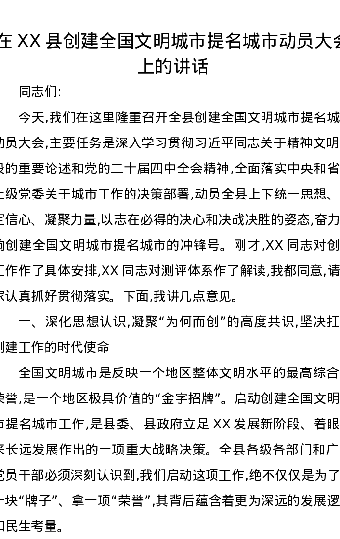 在XX县创建全国文明城市提名城市动员大会上的讲话