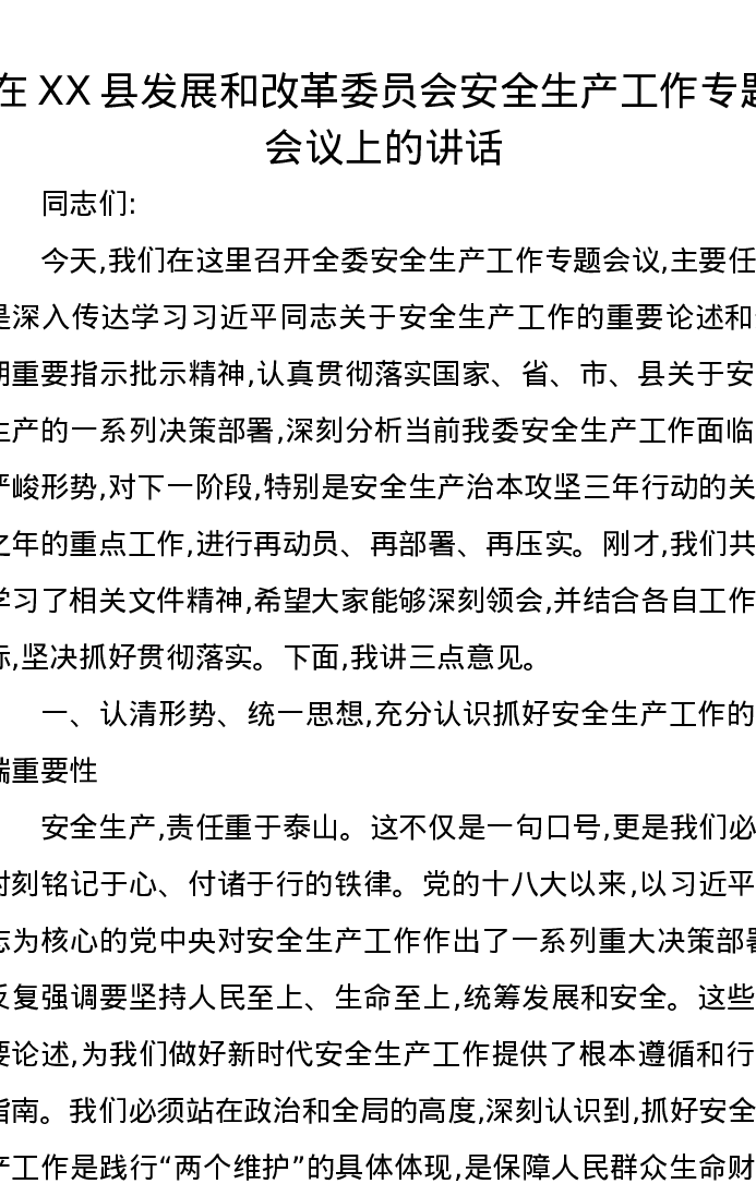 在XX县发展和改革委员会安全生产工作专题会议上的讲话