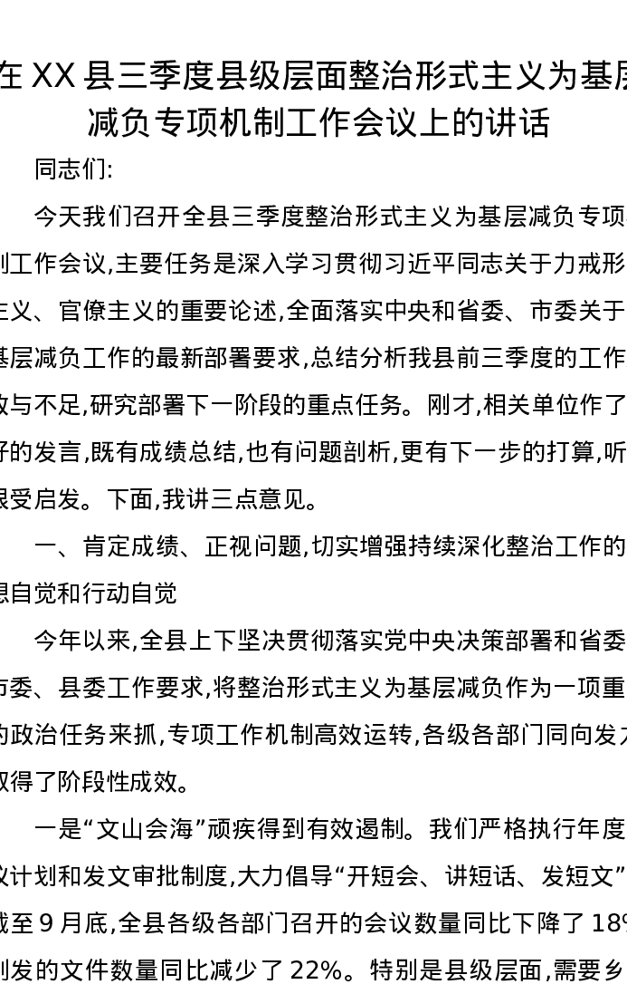 在XX县三季度县级层面整治形式主义为基层减负专项机制工作会议上的讲话
