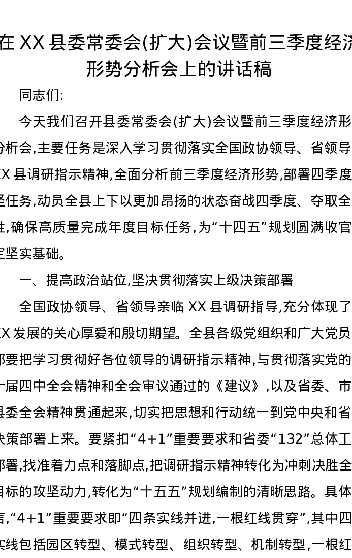 在XX县委常委会(扩大)会议暨前三季度经济形势分析会上的讲话稿