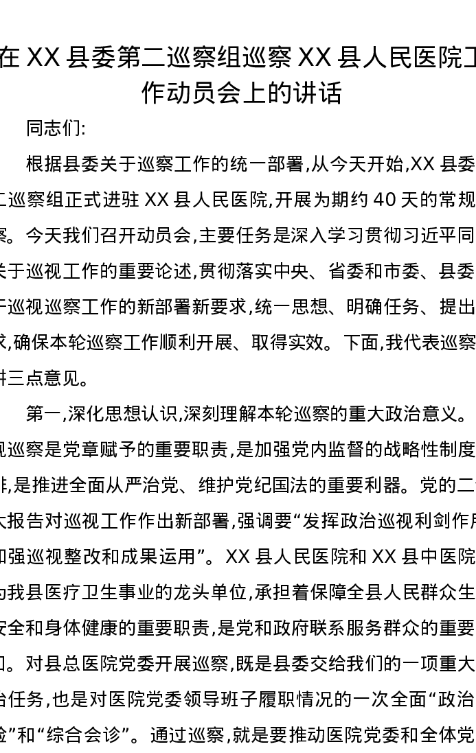 在XX县委第二巡察组巡察XX县人民医院工作动员会上的讲话2