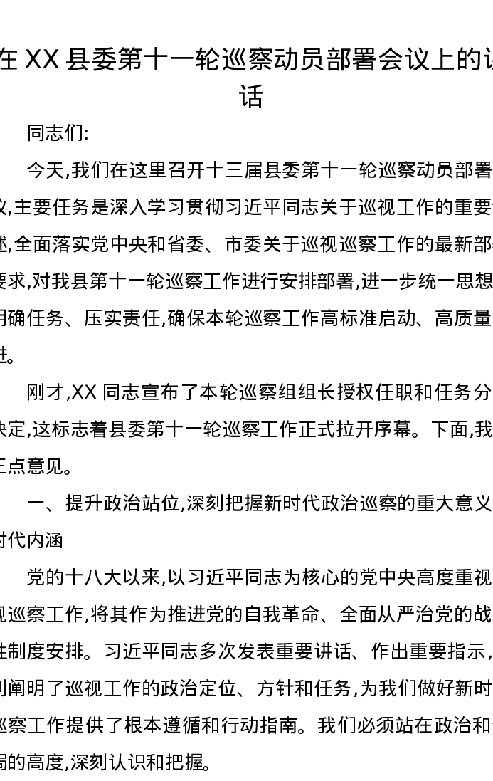 在XX县委第十一轮巡察动员部署会议上的讲话