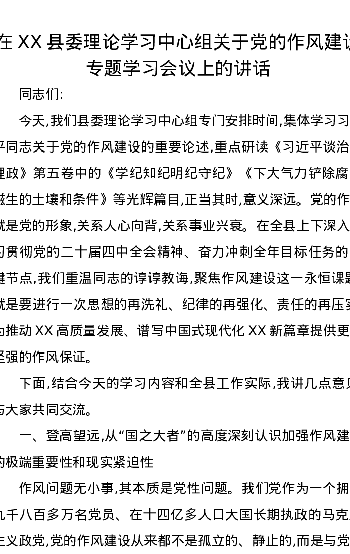 在XX县委理论学习中心组关于党的作风建设专题学习会议上的讲话