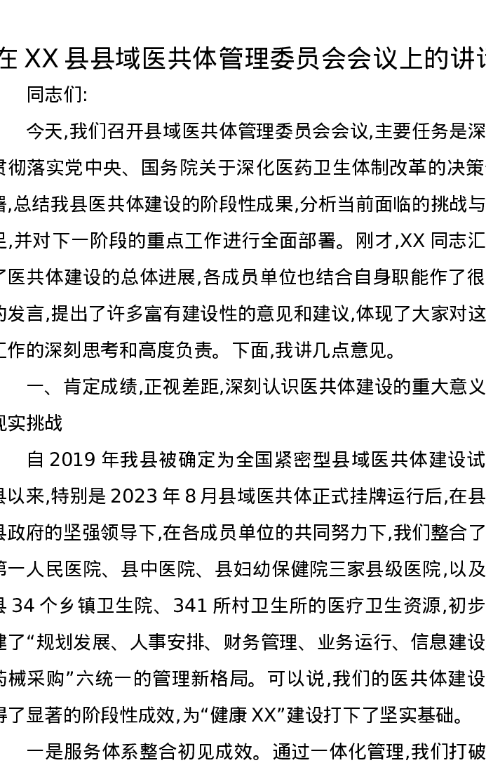 在XX县县域医共体管理委员会会议上的讲话