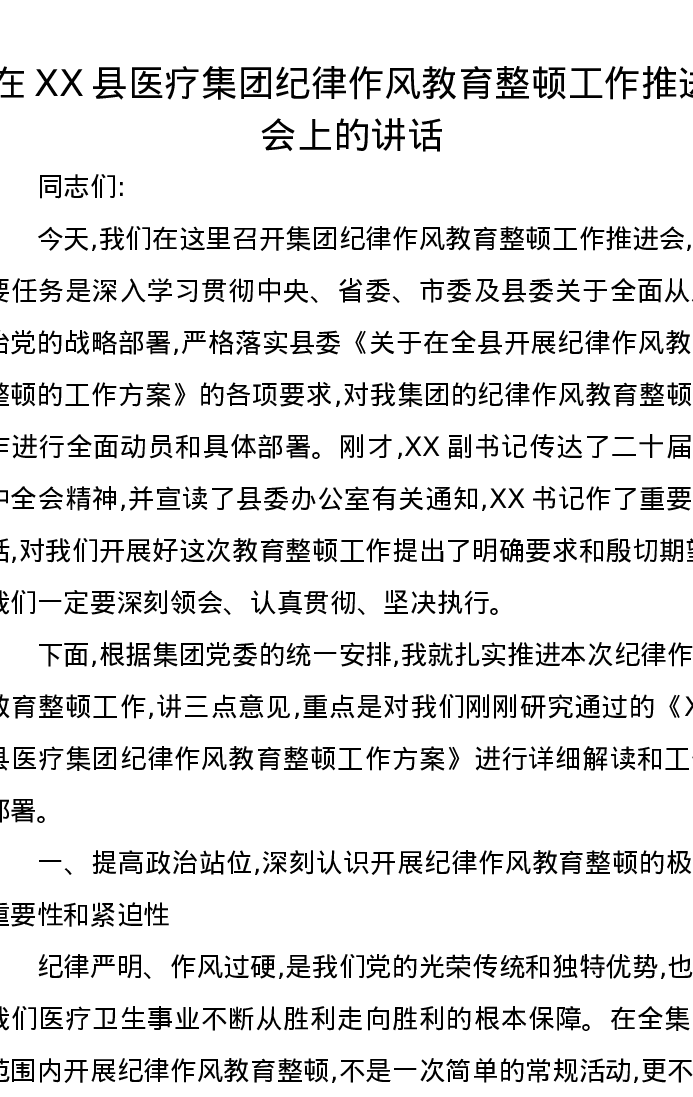 在XX县医疗集团纪律作风教育整顿工作推进会上的讲话