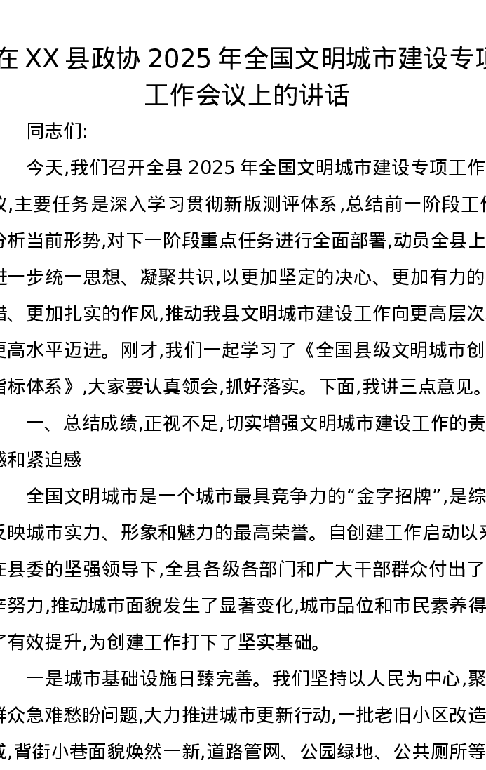 在XX县政协2025年全国文明城市建设专项工作会议上的讲话